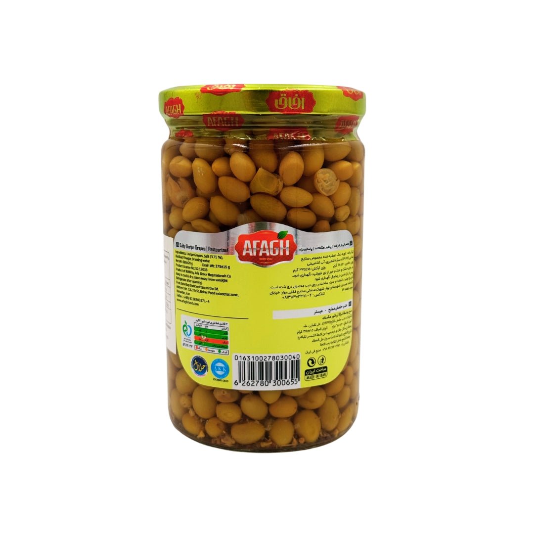 Afagh Salty Unripe Grapes (680 gr) are a unique Persian delicacy known as 'Ghooreh'. These are young, sour grapes preserved in brine. They are used in certain stews and dishes to provide a burst of tartness and a unique texture. They can be added to dishes like 'Khoresh Bademjan' for an authentic touch, or enjoyed as a sour snack.