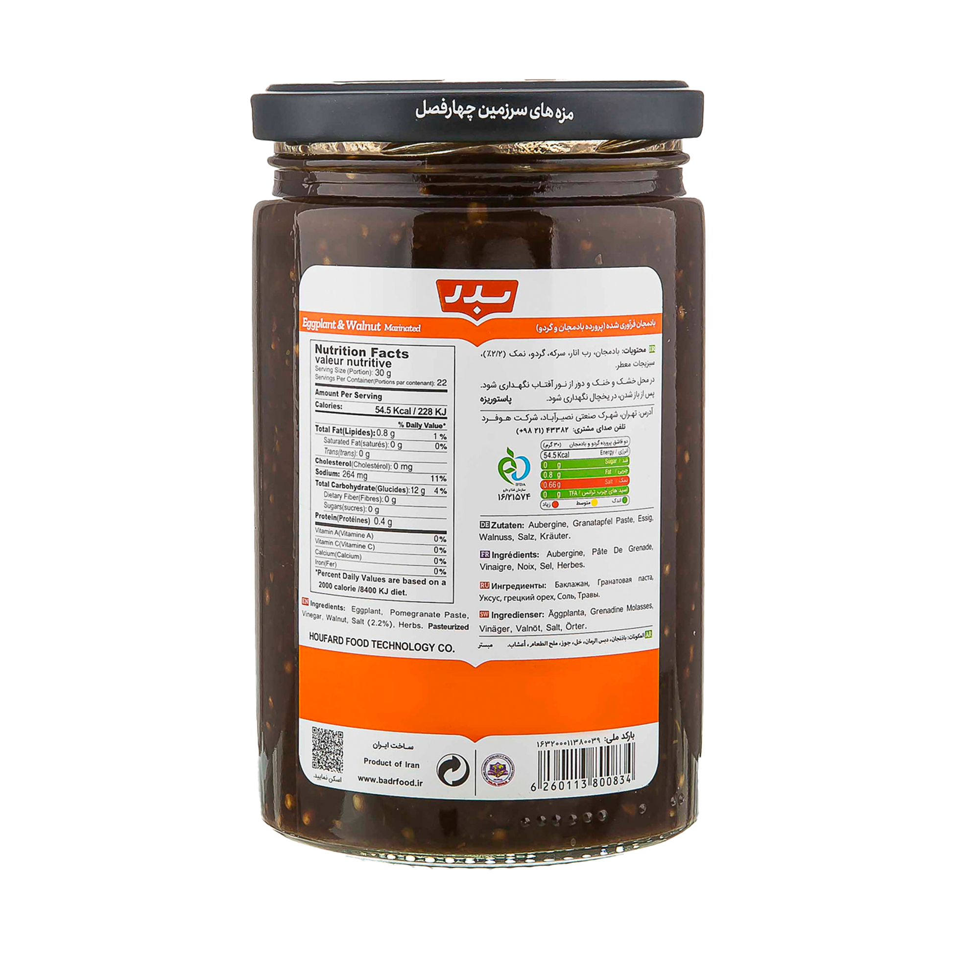 Badr Marinated Olives, Eggplant & Walnut (380 gr) is a gourmet condiment inspired by the flavors of northern Iran. This delicious mix combines green olives, tender eggplant, and crunchy walnuts in a flavorful marinade, which often includes herbs and pomegranate molasses. It's a version of the famous 'Zeytoon Parvardeh' and is a perfect appetizer or side dish.
