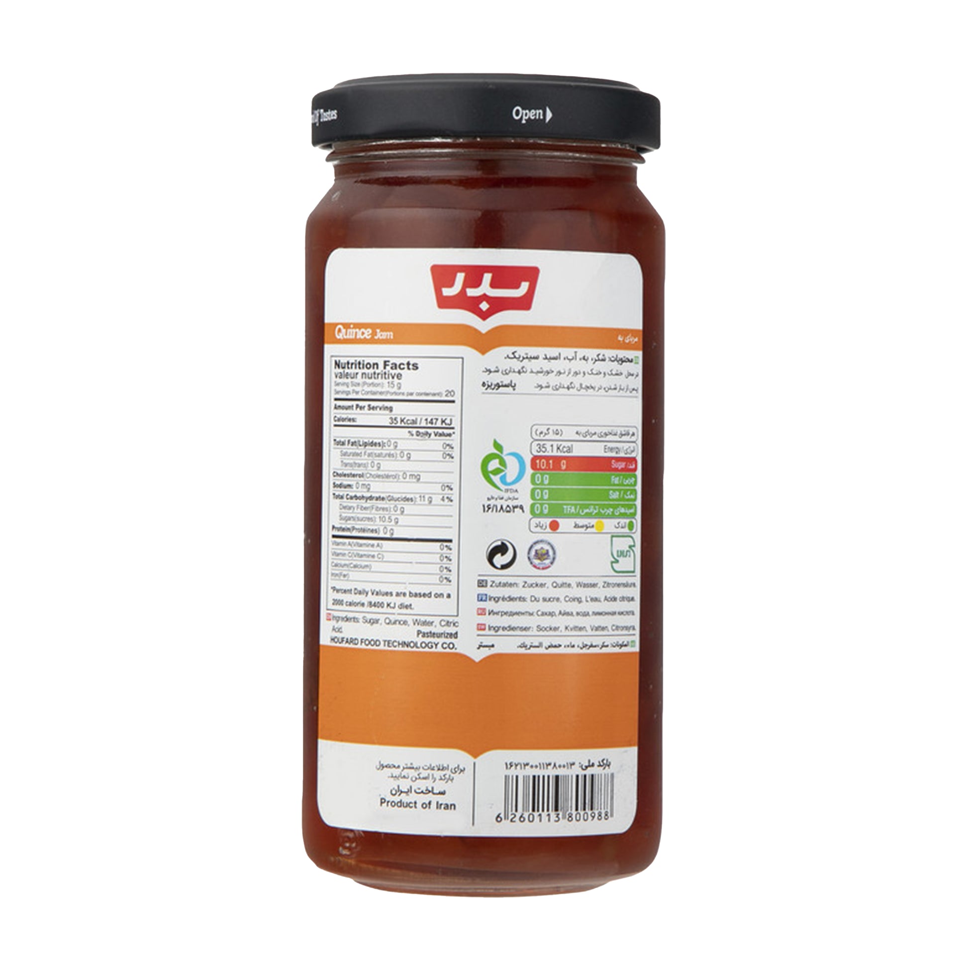 Badr Quince Jam (300 gr) is a classic Persian preserve, 'Moraba-ye Beh', known for its beautiful rosy hue and unique, aromatic flavor. The quince fruit transforms during cooking, developing a complex taste that is both floral and fruity. A gourmet jam that is a traditional and delicious part of an authentic Persian breakfast.