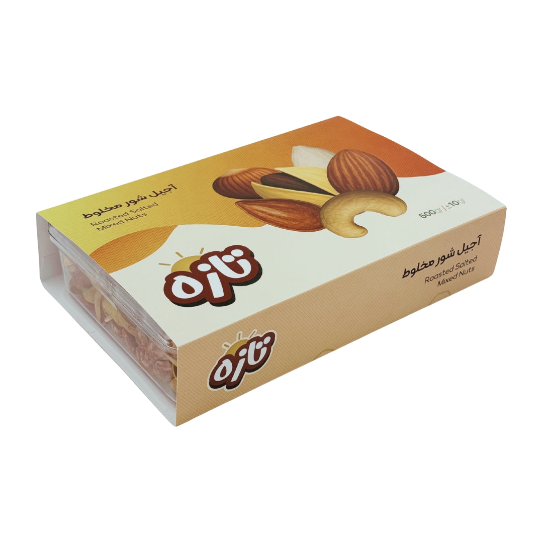 Tazeh Mix Salted Nuts (500 gr) is a premium assortment of perfectly roasted and salted nuts, known as 'Ajil' in Persian. This mix typically includes a delicious variety like pistachios, almonds, cashews, and more. It's the quintessential snack for hospitality in Iranian culture, perfect for serving to guests, enjoying during holidays, or as a high-energy daily snack.