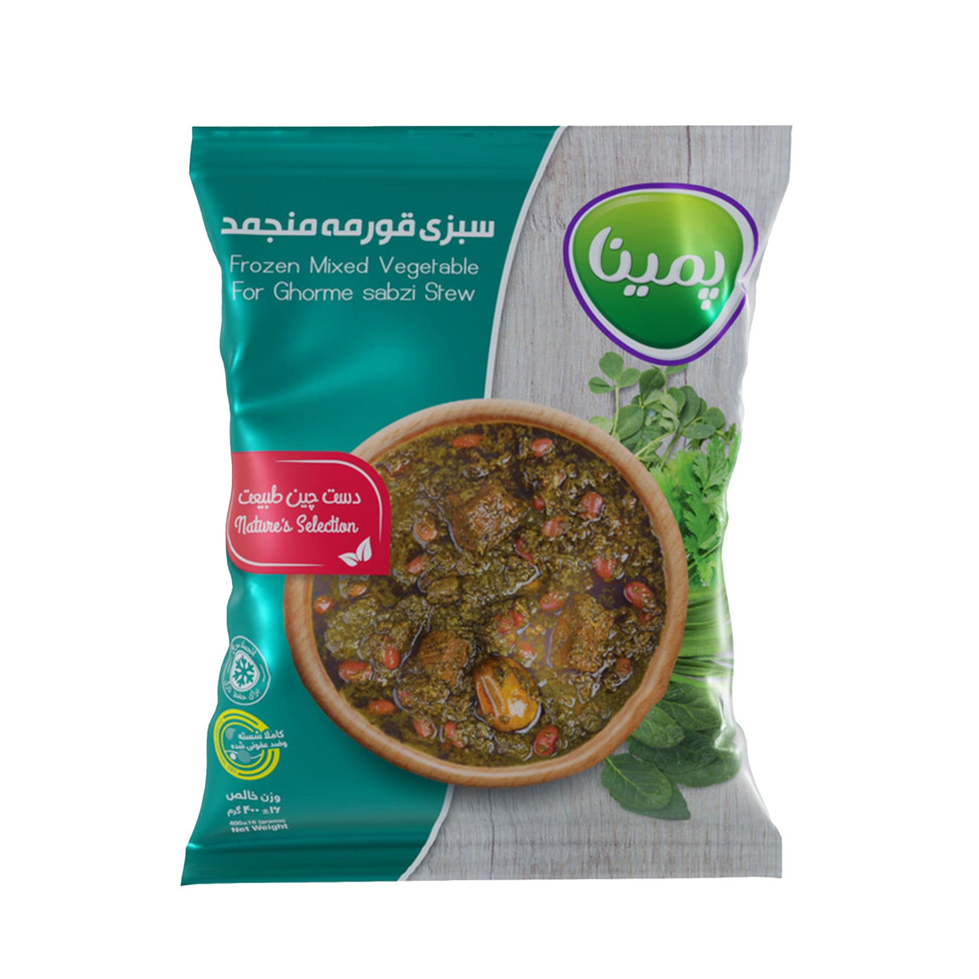 Pemina Frozen Fried Ghormeh Vegs (400 gr) is a major time-saver for cooking Iran's national dish. This product offers the essential herb blend for 'Ghormeh Sabzi', already chopped and expertly fried to bring out its deep, savory flavor. Just add the herbs to your pot with meat, beans, and dried limes to create an authentic and delicious stew with minimal effort.