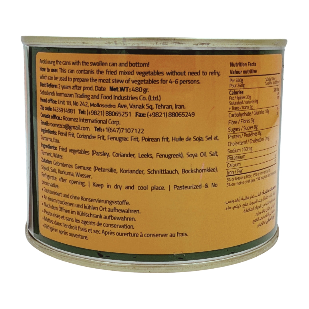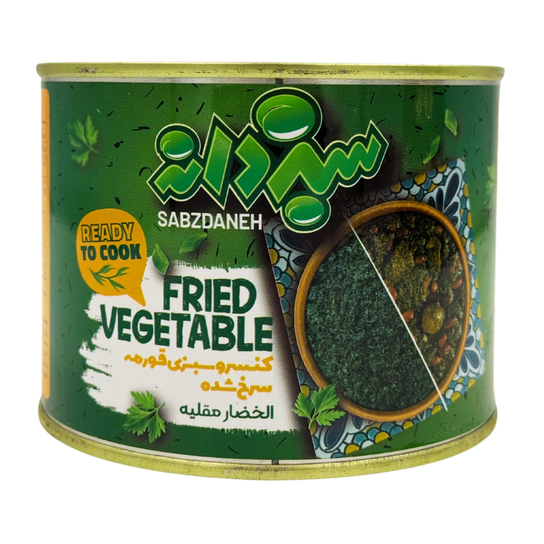 Sabzdaneh Fried Ghormeh Vegs (480 g) provides a convenient, ready-to-use base for the beloved Persian stew, 'Ghormeh Sabzi'. This canned product contains the essential blend of herbs, already chopped and fried, saving you hours of prep time. Simply add meat, beans, and dried limes to create a delicious and authentic stew. It is recommended to boil the unopened can for 20 minutes before use.