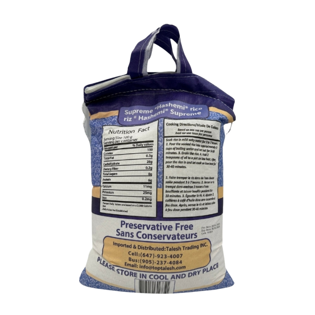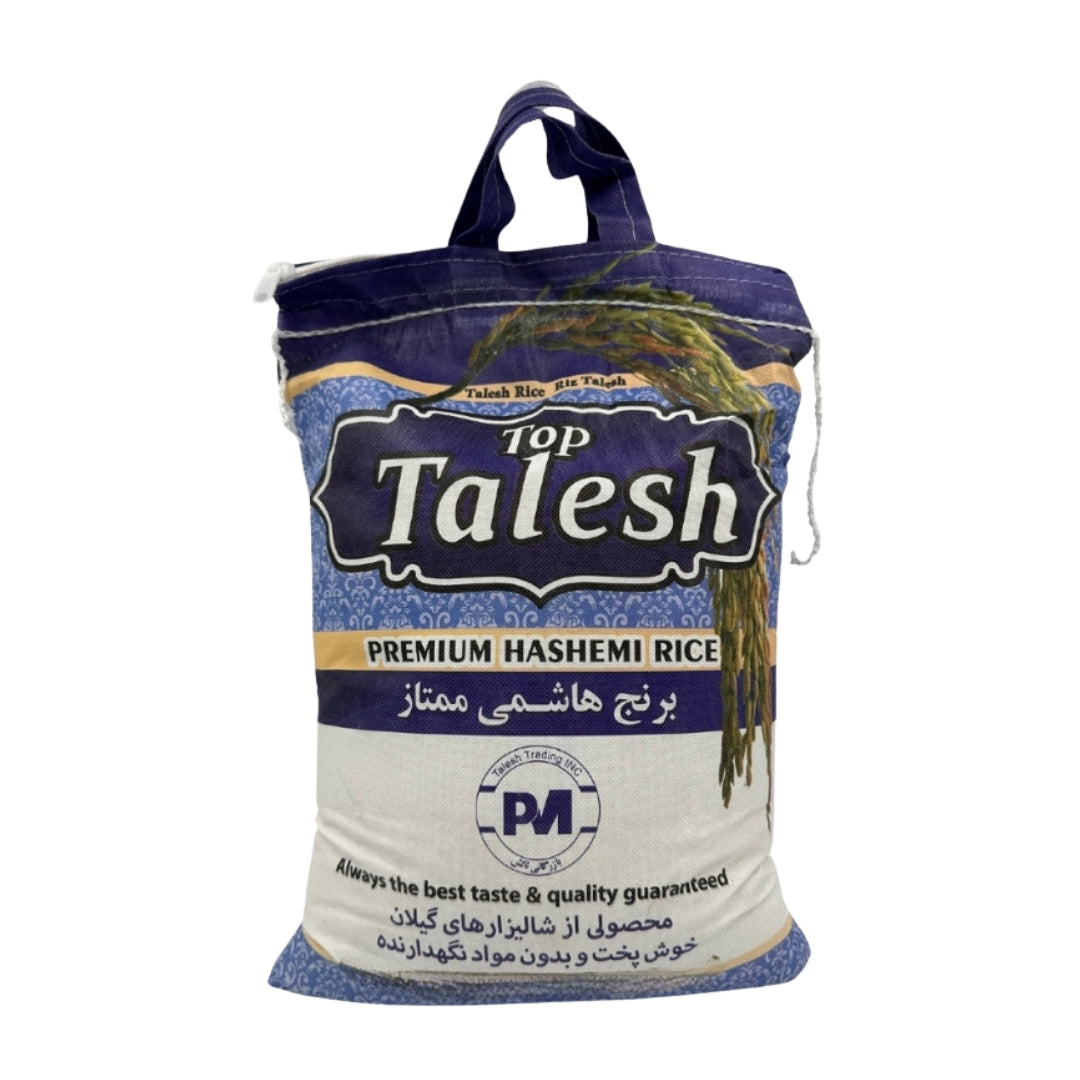 Enjoy premium Iranian rice in a smaller format with Talesh Hashemi Rice (2.5 kg). This 5 lb bag contains high-quality Hashemi rice, one of Iran's most popular varieties. It's cherished for its wonderful aroma, excellent grain elongation, and soft, fluffy texture when cooked. Perfect for smaller families or for trying out this exceptional rice.